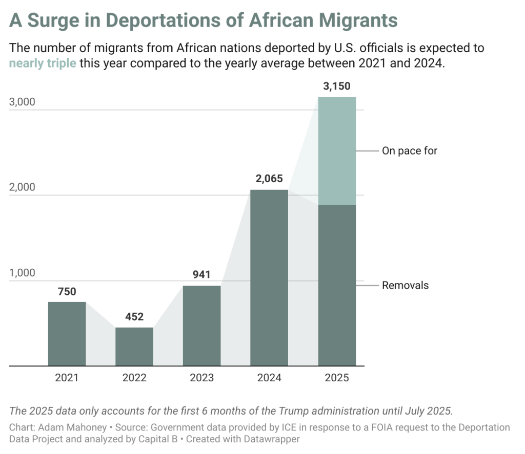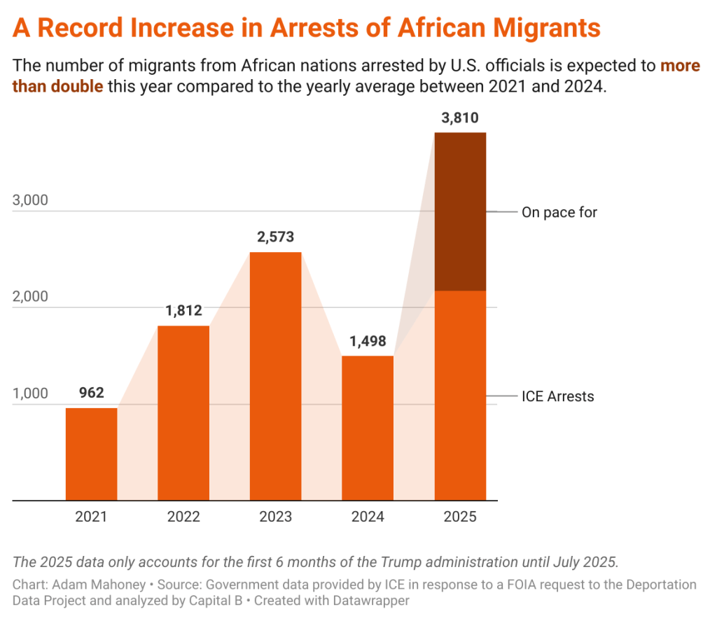 A new Capital B analysis found deportations of people from African nations are on pace to nearly triple compared to the Biden years, and the number of arrests and people held in U.S. detention centers have more than doubled this year.