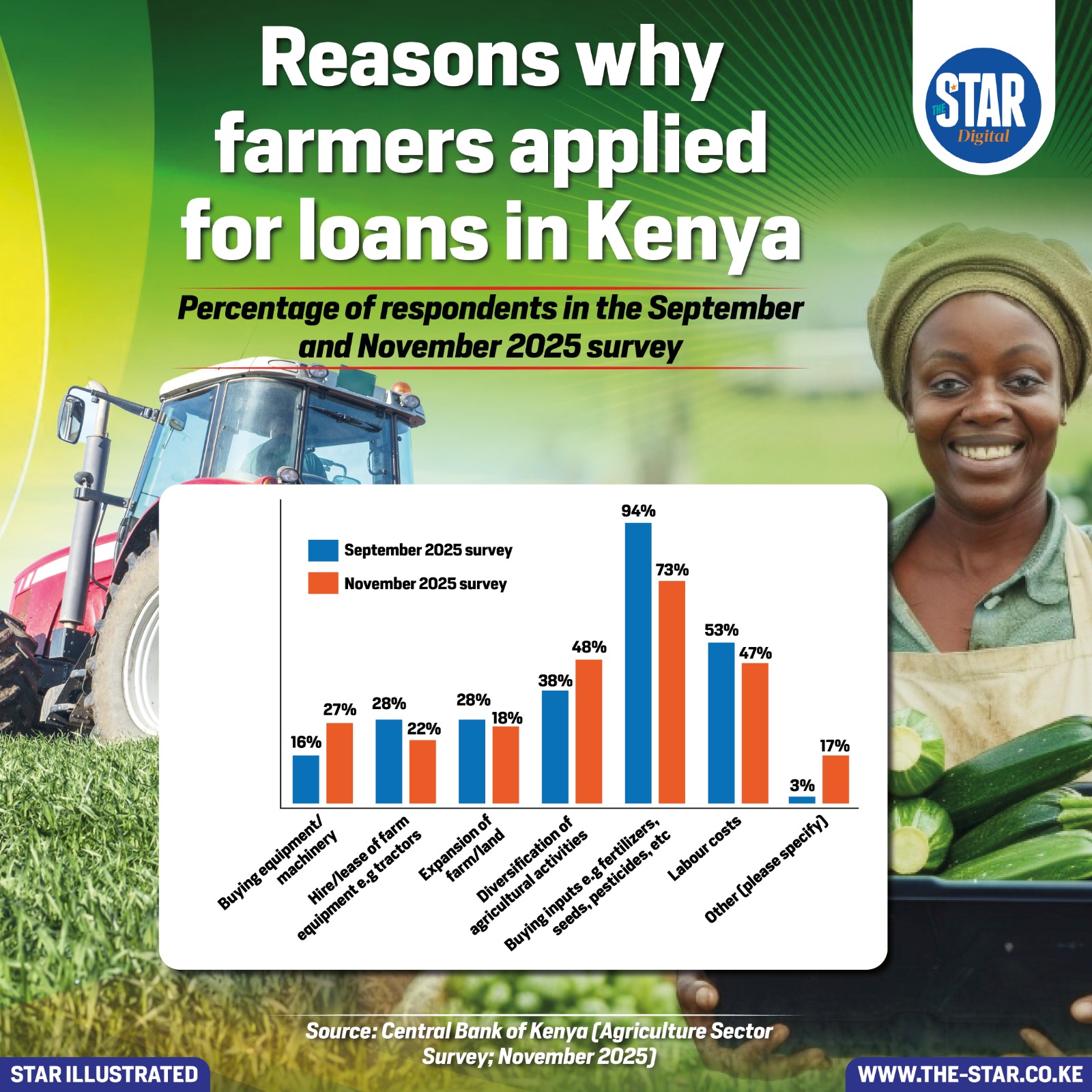 Findings from the Central Bank of Kenya’s Agriculture Sector Survey for September and November 2025 show that the dominant reason for loan applications was the purchase of inputs such as fertiliser, seeds, and pesticides.