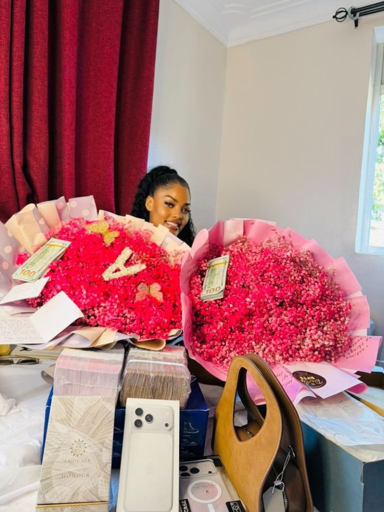 Part of the gifts is an iPhone 17 Pro Max, two bundles of cash in dollar bills, two big bundles of Ugandan shillings, two bouquets, a new fragrance, a bag, and so much more.