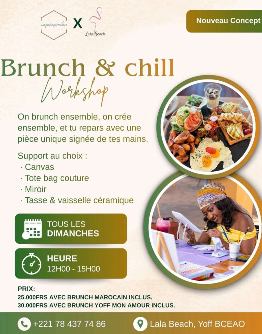 Le Brunch & Chill – Workshop est une expérience créative et gourmande organisée tous les dimanches à Lala Beach, à Yoff. Le concept est simple : on brunch ensemble, on crée ensemble, puis chacun repart avec une pièce unique réalisée de ses propres mains.