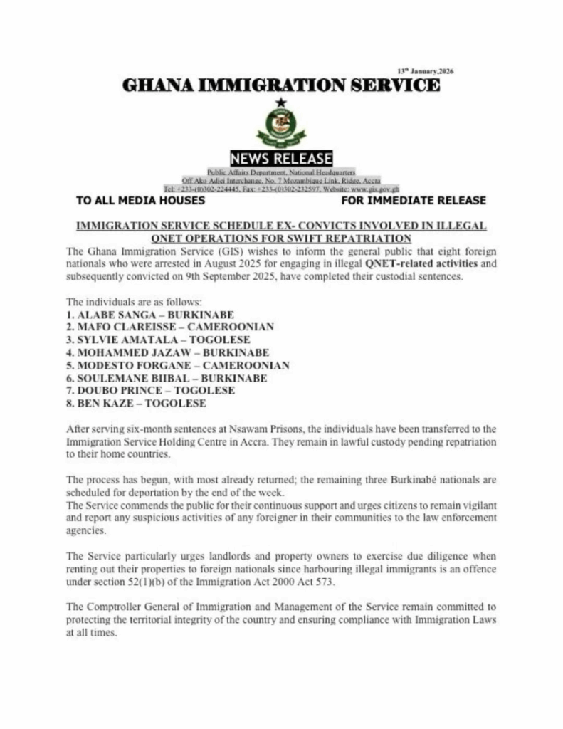 “The Ghana Immigration Service (GIS) wishes to inform the general public that eight foreign nationals who were arrested in August 2025 for engaging in illegal QNET-related activities and subsequently convicted on 9th September 2025, have completed their custodial sentences.”