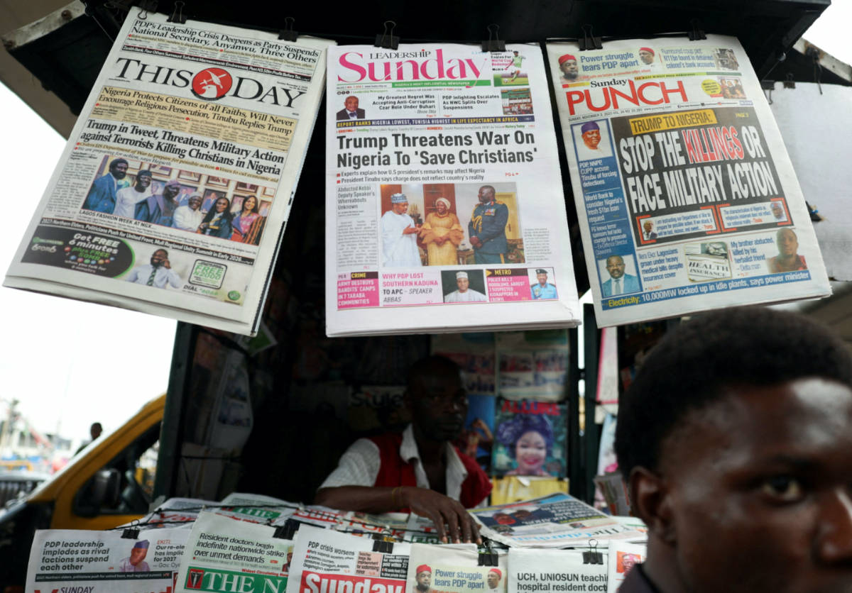Newspapers with articles reporting US President Donald Trump’s message to Nigeria over the treatment of Christians hang at a newspaper stand in Ojuelegba, Lagos, Nigeria, on 2nd November, 2025. PICTURE: Reuters/Sodiq Adelakun/File photo
