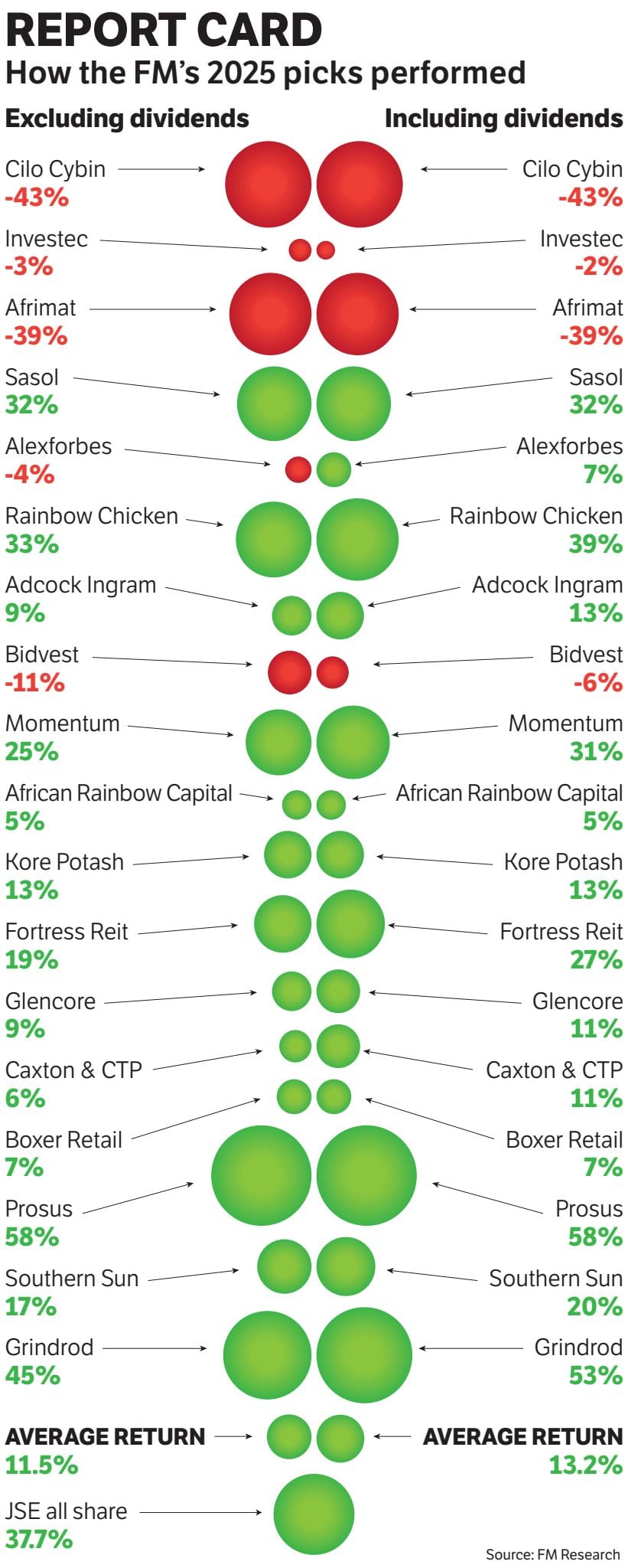 The FM’s Hot Stocks — or rather lukewarm — portfolio for 2025 lagged markedly. The 18-strong portfolio is inflexible in having equal weighting across the JSE’s main sectors — and that’s not an excuse, just a fact. The portfolio delivered an underwhelming 11.5% … 13.2% if dividends are worked back into the equation.