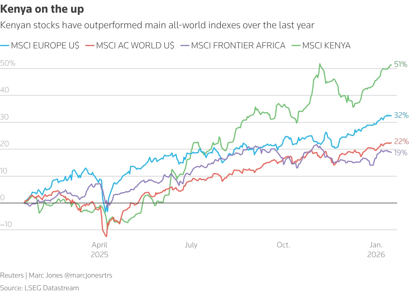 The Kenya Pipeline IPO comes amid a sharp rally at the Nairobi Securities Exchange. Kenyan shares have risen more than 50% in the past year, outperforming the MSCI Frontier Africa index.