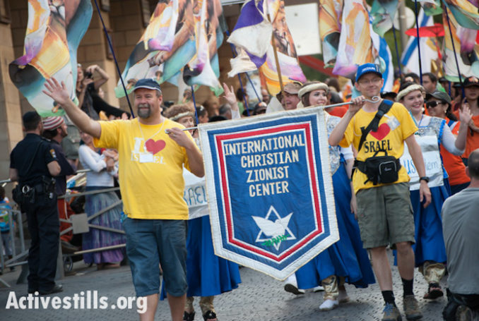 Des milliers de sionistes chrétiens de divers pays agitent des drapeaux lors de la marche annuelle de Jérusalem, le 4 octobre 2012. Les sionistes chrétiens sont devenus une force puissante dans la politique internationale en raison de leur soutien le plus souvent non critique à l’État d’Israël – Photo : Ryan Rodrick Beiler/Activestills.org