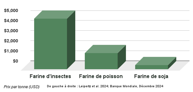 Une étude publiée dans Food and Humanity établit que la farine d’insectes coûte deux à dix fois plus cher que les alternatives conventionnelles, comme la farine de poisson ou de soja.