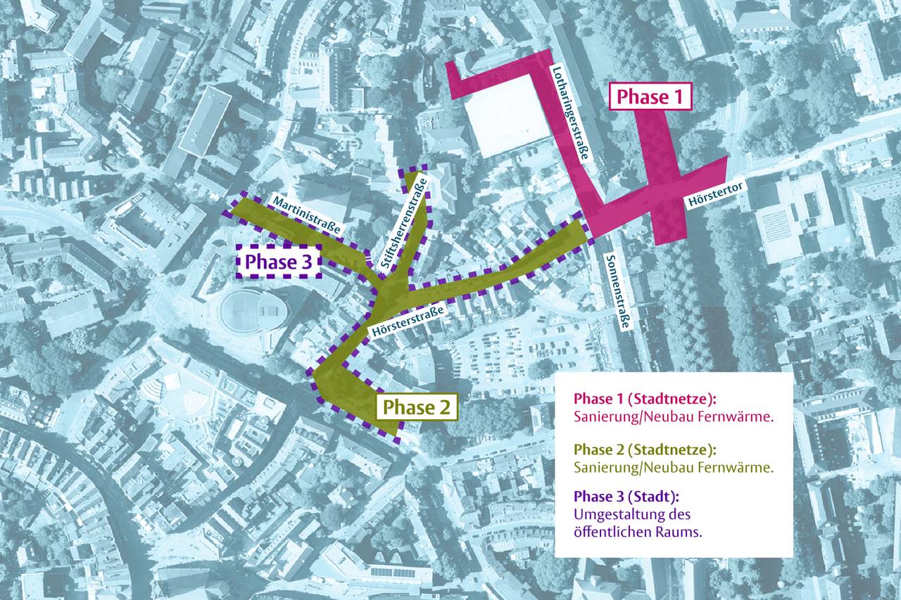 Im ersten Schritt werden Wärmeleitungen im Bereich Lotharingerstraße / Hörstertor / Promenade sowie in der Hörsterstraße zwischen Gartenstraße und Lotharingerstraße erneuert. Anschließend sind Leitungsarbeiten in weiteren Abschnitten der Hörsterstraße, der Stiftsherrenstraße sowie der Martinistraße vorgesehen. Jeder der fünf Bauabschnitte soll rund sechs Monate dauern. Die Arbeiten im Bereich der alten Stadtmauer werden archäologisch begleitet.