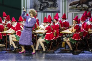 Getreu dem historischen Vorbild tragen die 40 Pinocchios spitzen Hut, rotes Wams mit weißem Kragen und kurze grüne Hosen. Hier wird das Rad nicht neu erfunden, aber alles so schön, liebevoll und klar verständlich gemacht, wie es für die Geschichte eben notwendig ist. Die Schule ist eine Schule, das Bett ein Riesen-Bett (in dem fast alle Pinocchios Platz finden), die Kutsche eine Kutsche…