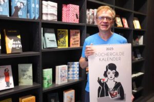 Karsten Schulz von der Buchhandlung Litfass präsentiert das Büchergilde-Angebot in einer eigenen Regalwand. Foto: Susanne Schulte für Nordstadtblogger.de