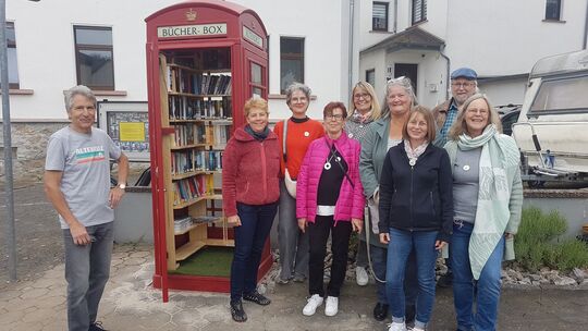 19.05.2025, 17:00 UhriIn der Bimbes-Bücher-Box Altendiez wartet jetzt jede Menge Lesestoff auf Abnehmer und zum Tauschen. Karl Bernhard Giebenhain (von links) und Bürgermeisterin Petra Hofmann sowie das Büchereiteam begrüßten die Gäste. Kunz Thorsten