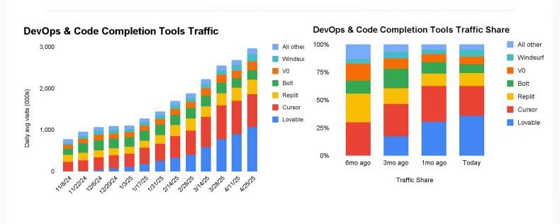 Was auch hervorsticht: Microsoft hat den Launch des Coding-Agenten von GitHub als größte News platziert. Das hat sicher einen Grund, denn aktuell gibt es einige Startups am Markt (v.a. Cursor/Anysphere sowie Lovable), die sehr viele User zu sich gelockt haben. Glaub man den Zahlen von SimilarWeb, hat GitHub Copilot, eigentlich der Vorreiter der Branche, stark an Boden verloren: