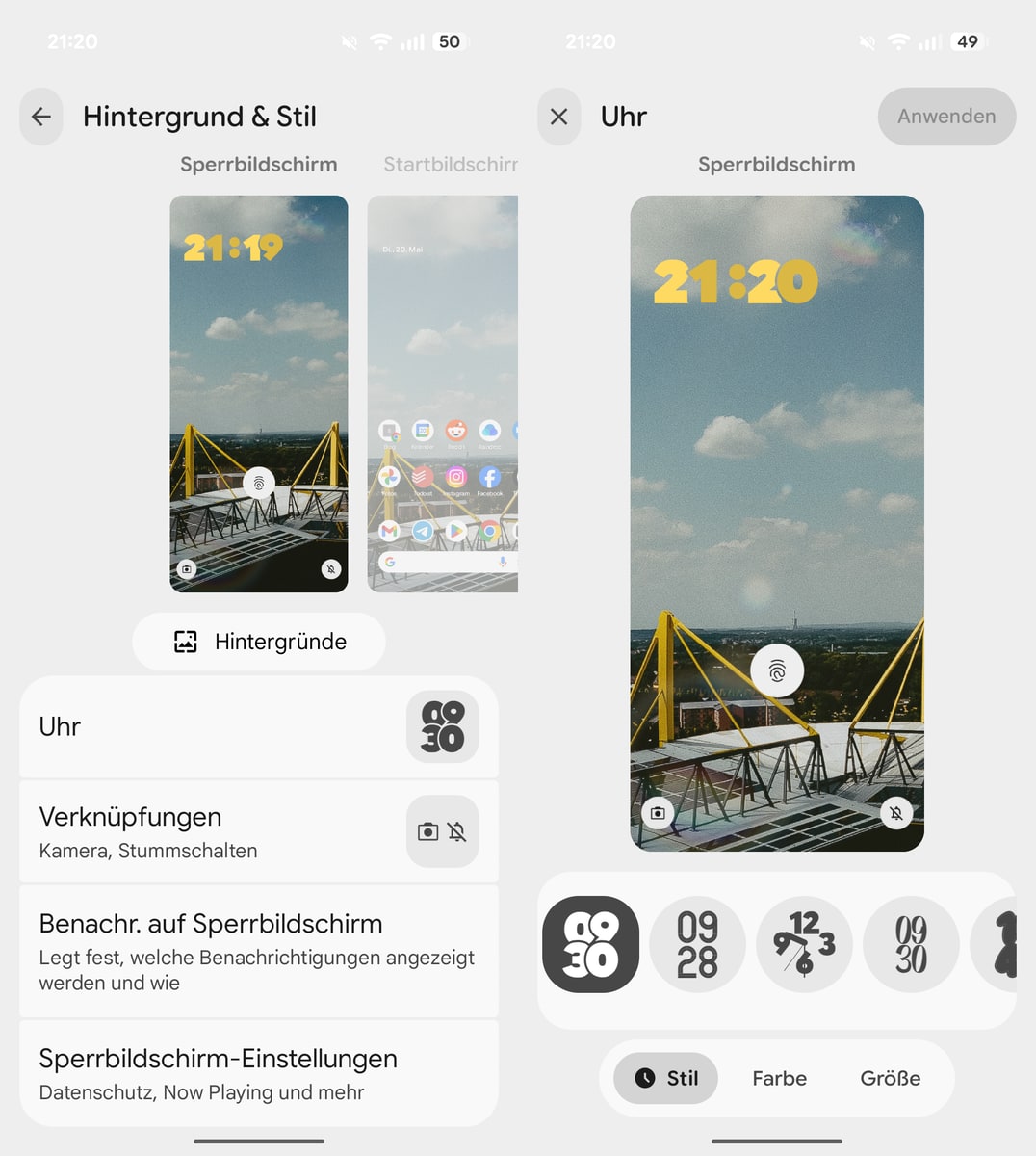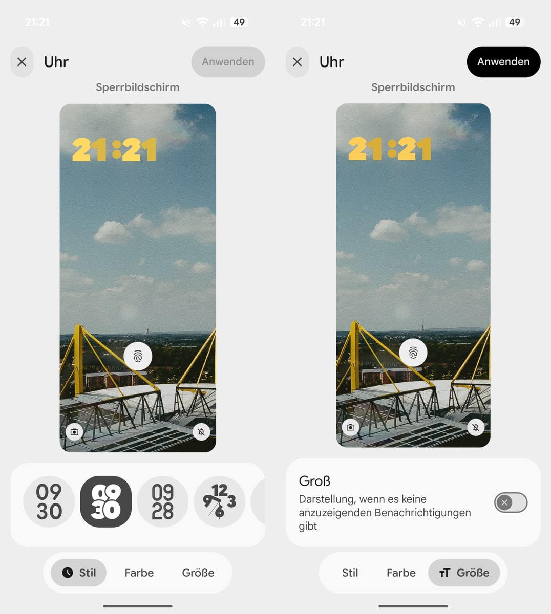 Da findet ihr auch noch andere Einstellungen. Nehmen wir die Uhr-Einstellungen: Statt wie bisher über ein kleines Zahnrad und Wischgesten, findet man jetzt einen eigenen, dedizierten Button für alle Uhren-Optionen. Das neue Menü präsentiert die verschiedenen Uhrenstile mit kleinen Vorschaubildern – deutlich übersichtlicher als zuvor, man muss ich aber definitiv ein paar Minuten reinfummeln. Gefällt mir aber ganz gut alles.