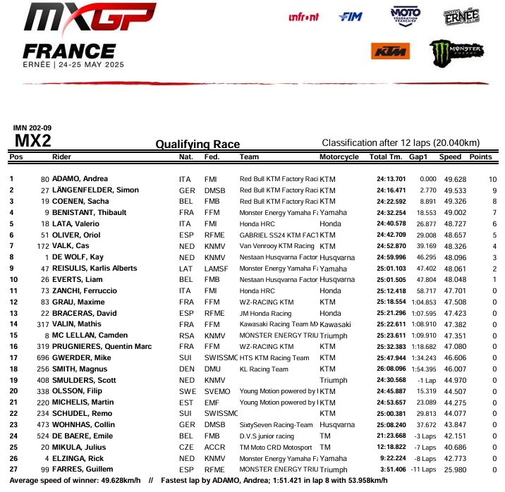 Am Ende überquerte Adamo die Ziellinie mit einem Vorsprung von 2,770 Sekunden. Sacha Coenen komplettierte einen Red Bull KTM-Sieg im ersten Drittel und hielt den dritten Platz von Anfang an.