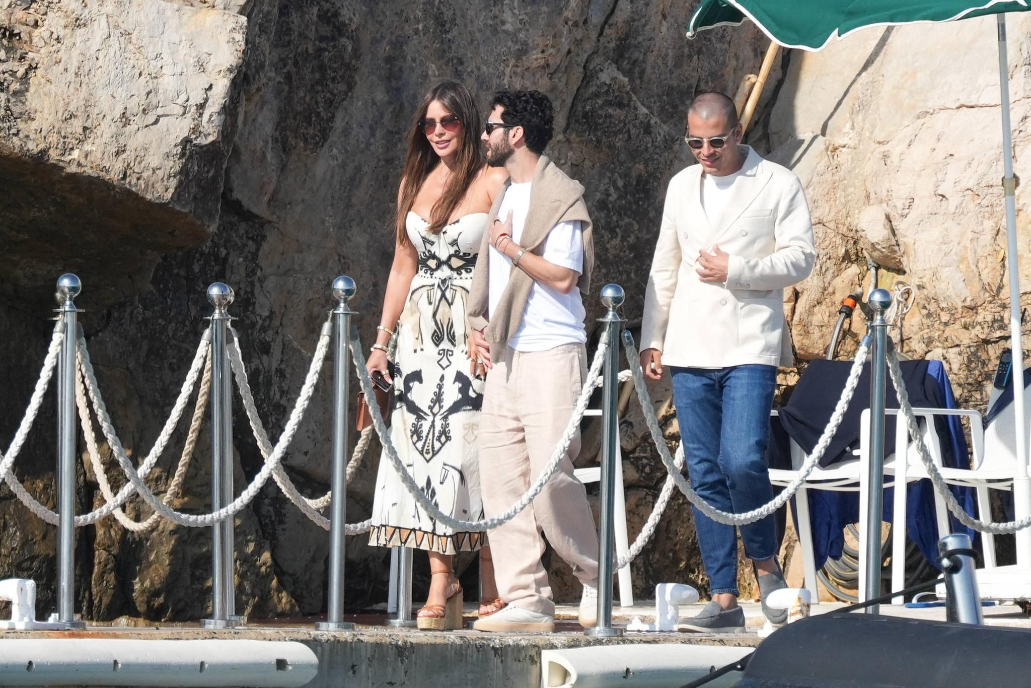 Die Ex-Ehefrau von Manganiello trug ein lockeres Bandeau-Kleid in Creme- und Weißtönen mit schwarzen Mustern. Ihre langen Haare wehten Vergara offen um ihr Gesicht, ihre Augen schützte sie mit einer großen Sonnenbrille vor der Sonne. Ihr bisher unbekannter Begleiter lief vor ihr einige Steinstufen zum Bootsanleger herunter und bat ihr dann seine Hand zur Hilfe an. Danach lief das Paar einige Meter händchenhaltend nebeneinander her.