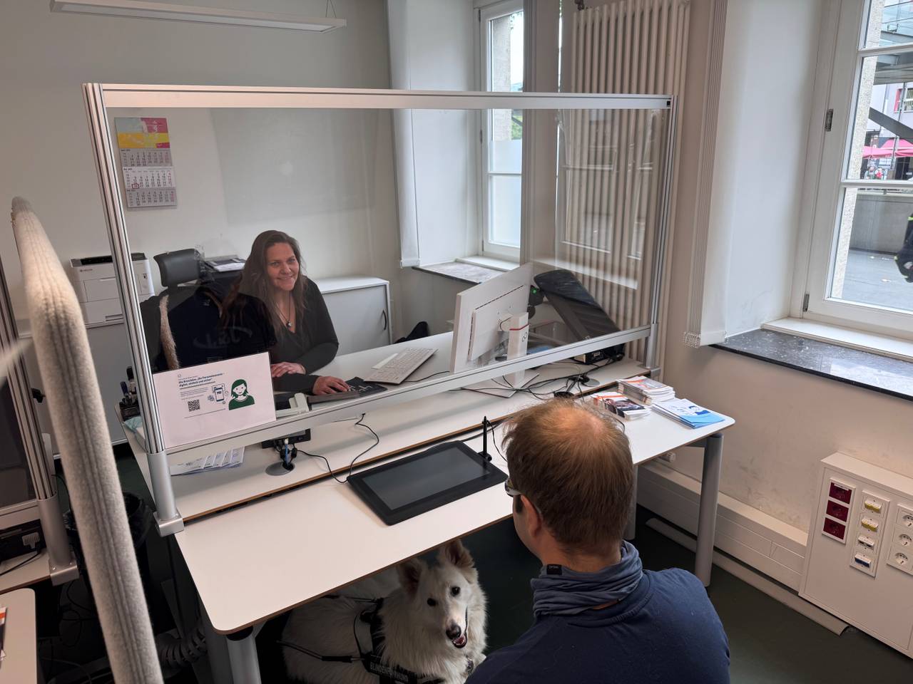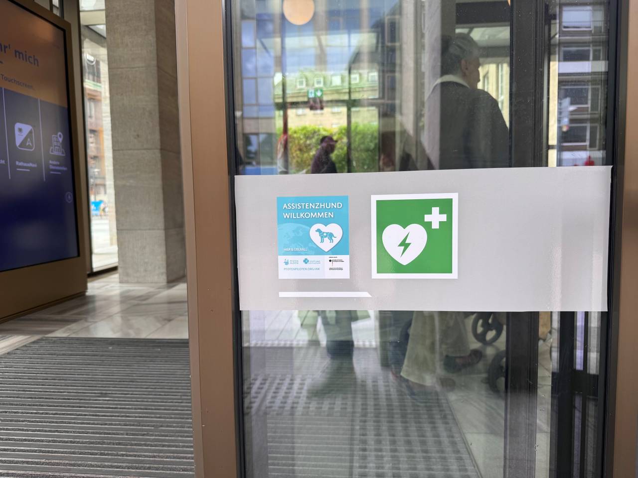 Gesetzlich geregelt ist der Zutritt von Assistenzhunden in öffentliche Gebäude seit dem 1. Juli 2021 durch das Teilhabestärkungs- und Behindertengleichstellungsgesetz. Um für die Regelung noch mehr zu sensibilisieren, hat die Stadt am Montag (26.5.) mehrere Aufkleber der bundesweiten Kampagne „Assistenzhunde willkommen“ am Eingang des Rathauses angebracht. Initiiert wurde die Kampagne durch das Bundesministerium für Arbeit und Soziales und den Verein „Pfotenpiloten“.