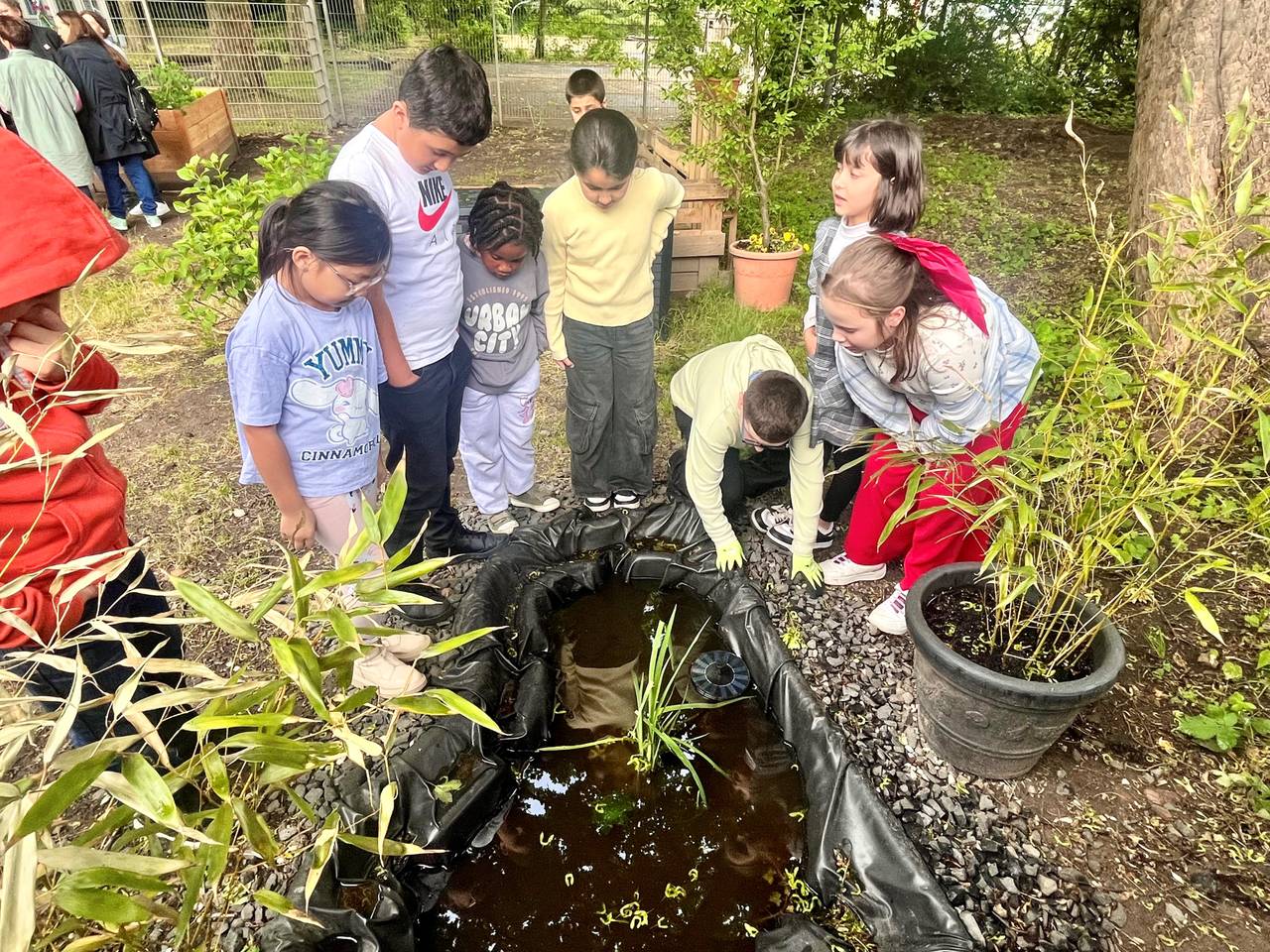 Ein grünes Klassenzimmer in Essen: Der Lions-Club unterstützt die Hüttmannschule mit Hochbeeten, Teich und Ruhezone für 500 Kinder.