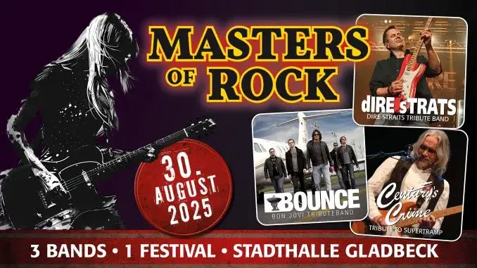 Gladbeck – 02.06.2025 – Masters Of Rock kommt am 30. August 2025 erstmals nach Gladbeck. Der Festival-Name steht für Rock-Entertainment auf höchstem Niveau und verspricht ein unvergessliches Konzerterlebnis. Mit Centruy’s Crime, Dire Strats und Bounce sind drei Schwergewichte des Classic Rock am Start, die seit vielen Jahren die Musikfans in halb Europa begeistern.