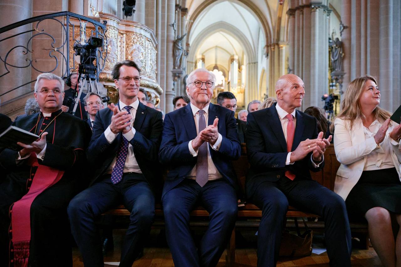 v.l.n.r.: Dr. Udo Bentz, Erzbischof von Paderborn, Hendrik Wüst (MdL), Ministerpräsident des Landes Nordrhein-Westfalen, Frank-Walter Steinmeier, Bundespräsident, Dr. Georg Lunemann, der Direktor des LWL, und seine Ehefrau Claudia Miklis beim Festakt zu 1.250 Jahre Westfalen im Hohen Dom zu Paderborn.