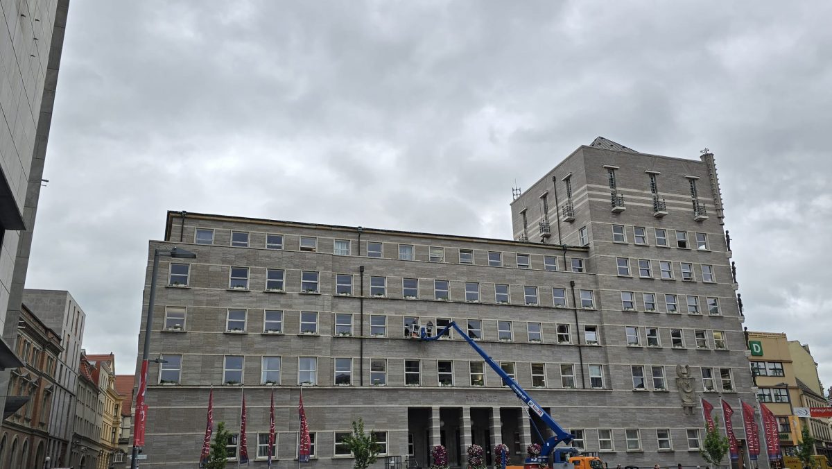Pünktlich zum Start der Händelfestspiele zeigt sich der Ratshof in Halle (Saale) nicht mehr nur grau. Denn an den Fenstern blüht es wieder. Am Freitag wurden durch die Mitarbeiter des Grünflächenamtes an den 53 Fenstern zum Marktplatz Geranien in den Stadtfarben Rot und Weiß angebracht und verschönern so den Sitz der Stadtverwaltung. Im Sommer blühen dann die Geranien in voller Pracht.