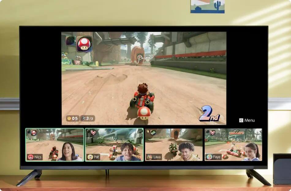 Mit GameChat führt Nintendo erstmals eine vollwertige Voice- und Video-Chat-Lösung direkt in die Konsole ein. Bis zu 12 Personen können gleichzeitig an Sprachchats teilnehmen, während bis zu vier Personen ihre Bildschirme teilen können. Das integrierte Mikrofon mit Noise-Cancelling und automatischer Verstärkungsregelung sorgt für passende Aufnahmen. Die Bildschirmfreigabe-Funktion ermöglicht völlig neue kooperative Spielerfahrungen so wie damals bei der Wii U. Wir können unsere Screens teilen, selbst wenn wir unterschiedliche Spiele spielen, was Coaching, gemeinsames Erkunden oder einfach sozialen Austausch während des Spielens ermöglicht. Der neue C-Knopf am rechten Joy-Con ermöglicht den sofortigen Zugriff auf alle GameChat-Funktionen, ohne das aktuelle Spiel zu unterbrechen. Und dank zweitem USB-C-Anschluss an der Oberseite nebst jenem unten gibt es mehr Flexibilität mit Zubehör!