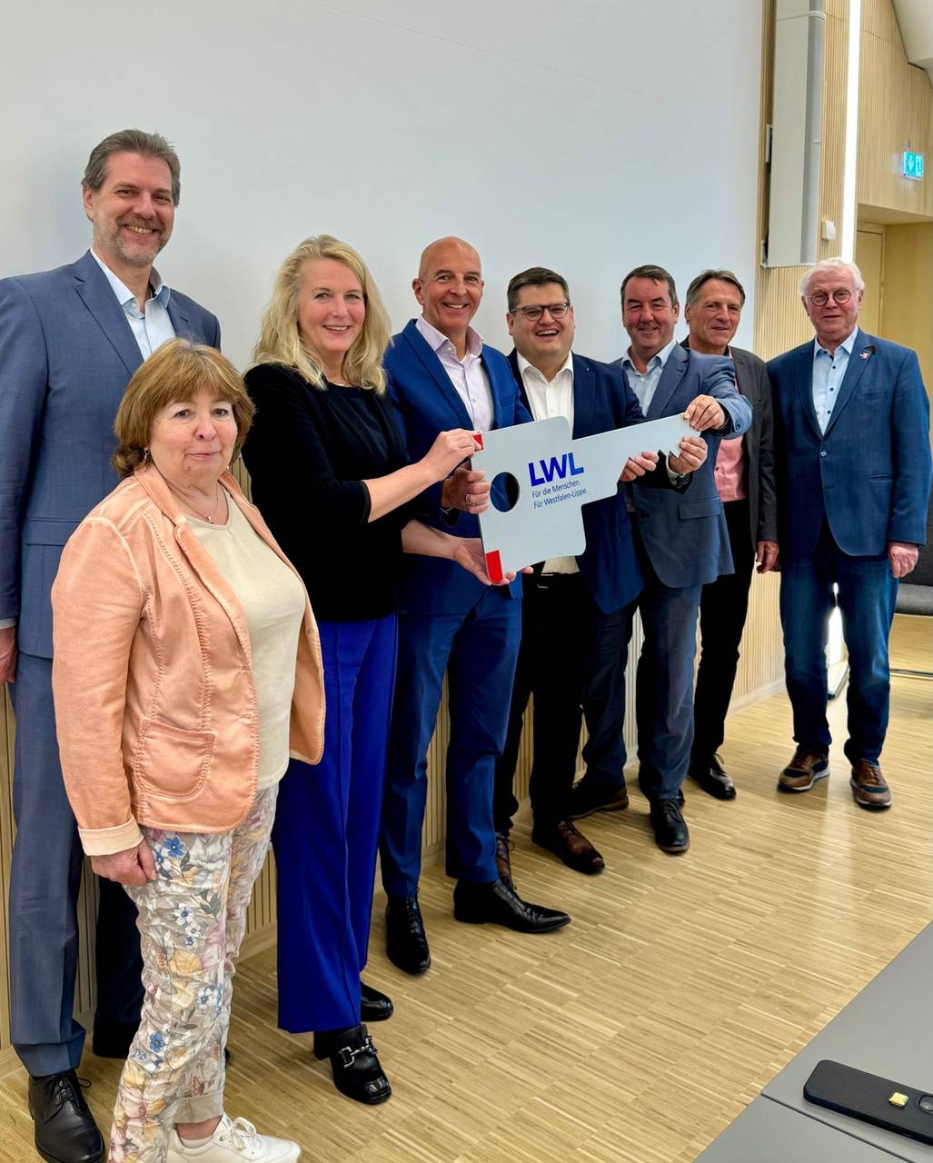 Der Direktor des LWL, Dr. Georg Lunemann (4.v.l.), und die LWL-Kämmerin Birgit Meyer (3.v.l.) übergeben den Schlüssel für das neue Verwaltungsgebäude an LWL-Baudezernent Urs Frigger (4.v.r.) und BLB-Betriebsleiter Matthias Gundler (3.v.r.). Es gratulieren (v.l.n.r.) die Mitglieder des LWL-Bauausschusses Thorsten Schmolke (Grüne, stellv. Vorsitzender), Ulla Ecks (SPD), Rolf Meiberg (CDU) und Klaus Baumann als Vorsitzender der LWL-Landschaftsversammlung.