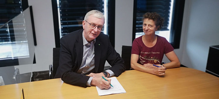 11. Juli 2022 die Unterzeichnung des Notarvertrages durch die jeweiligen Vorsitzenden, links Pfarrer Jörg Hohlweger, rechts Anke Süper.