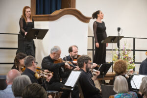 Während des Stabat mater wurden die zwei Solistinnen hinter dem Orchester und erhöht auf dem Altar platziert. So konnten sie ihre Stimmen in der kleinen Kirche optimal erklingen lassen. In der Bach-Kantate waren die beiden anderen Solistinnen vor dem Orchester platziert. Ironischerweise waren sie dadurch, dass sie etwas näher am Publikum standen, weniger deutlich zu hören, vor allem von meinem Platz an der rechten Seite des Altars in der vorderen Reihe. Teuscher, die auf der linken Seite des Altars stand, war nicht immer so präsent, wie sie es gewesen wäre, wenn die Solistinnen auf dem Pult hinter dem Orchester gestanden hätten.