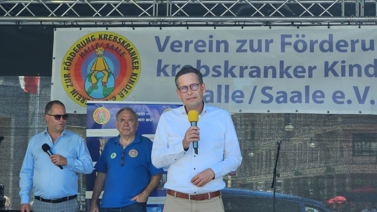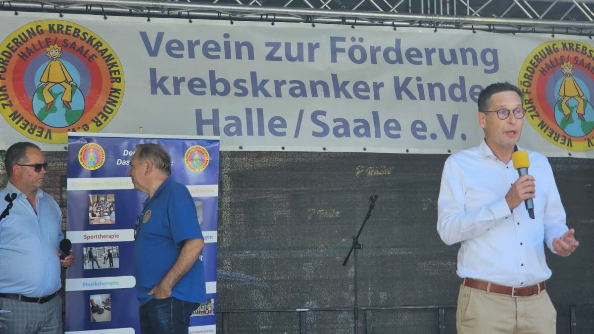 Einer der berührendsten Momente des Festes war die Rede von Halles Oberbürgermeister Dr. Alexander Vogt, der in bewegenden Worten über seine erste persönliche Erfahrung mit dem Thema Krebs sprach – als zehnjähriger Junge, selbst Patient in der Universitätsklinik Halle. „Ich lag da wegen einer Blinddarmentzündung – mit mir im Zimmer ein Junge in meinem Alter, der hatte Krebs“, erinnerte sich Vogt sichtlich bewegt. „Für mich als Kind war das unbegreiflich – dass jemand in meinem Alter womöglich bald nicht mehr leben würde.“