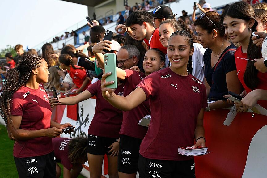 Gibt die EM dem Frauenfussball in der Schweiz nochmals einen Extraboost? Nati-Spielerin Aliyah Pilgrim (rechts) beim öffentlichen Training in Grenchen.