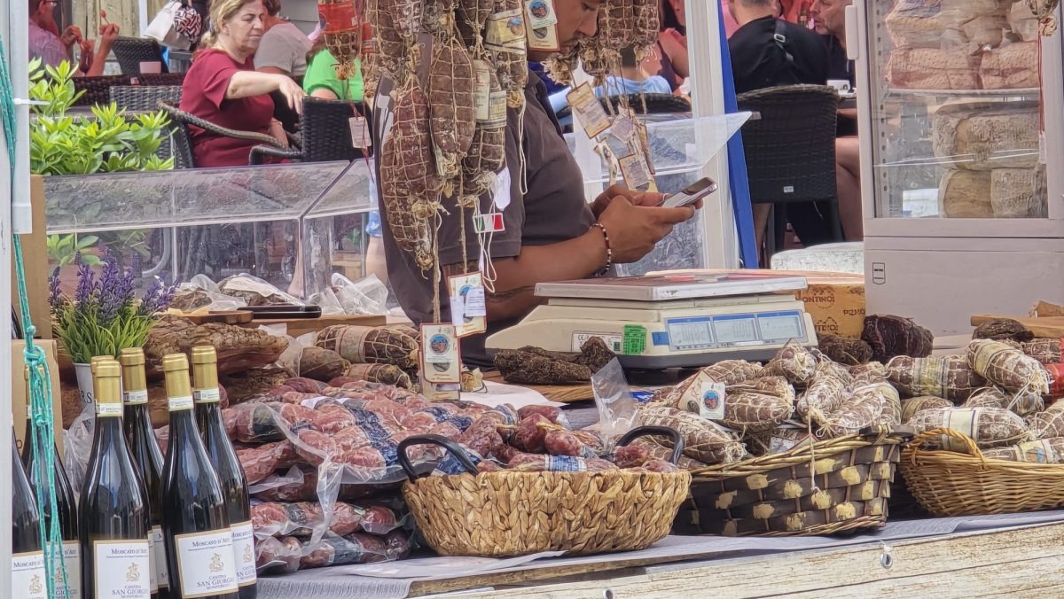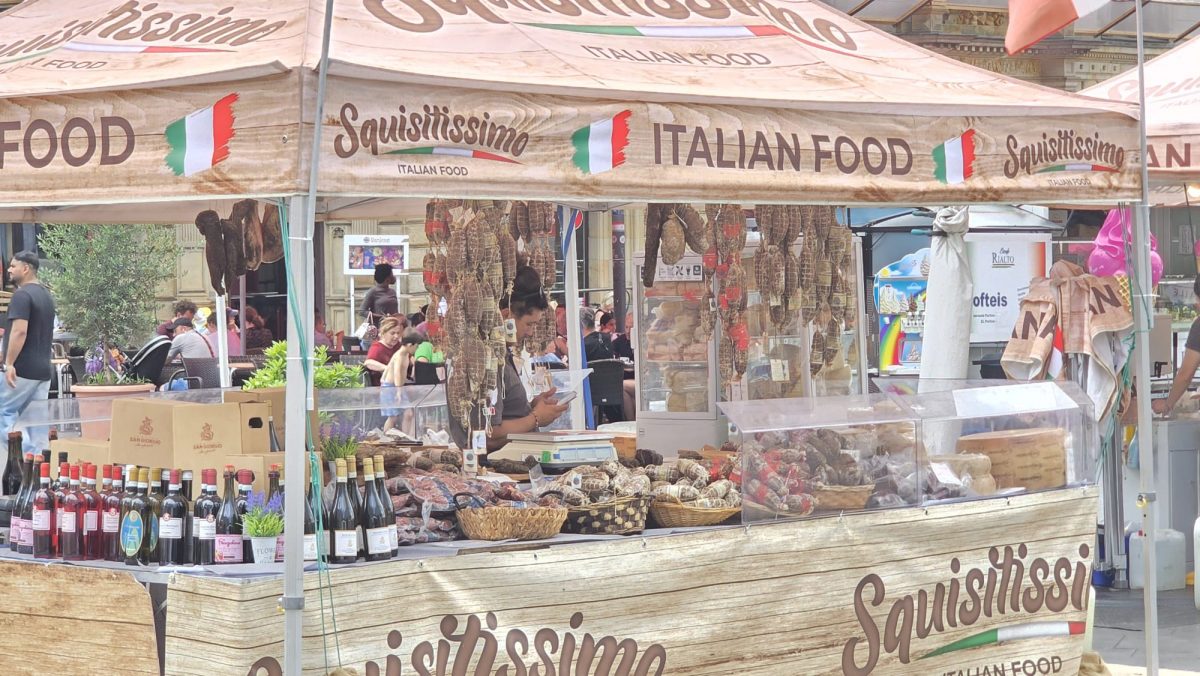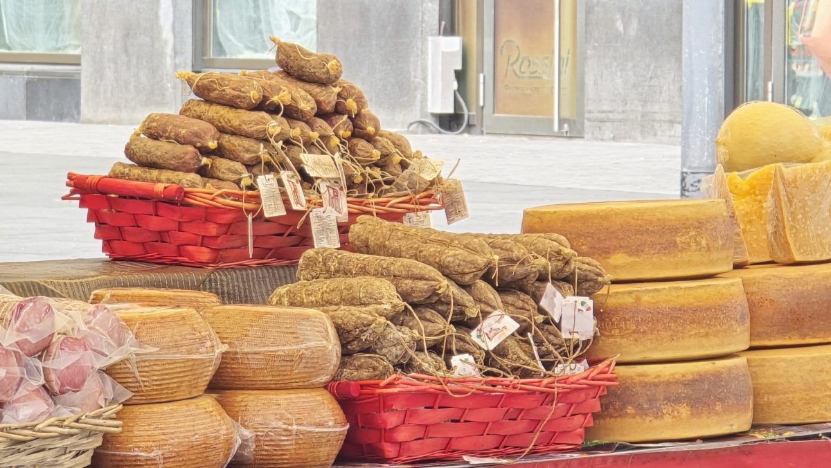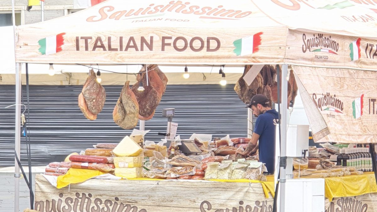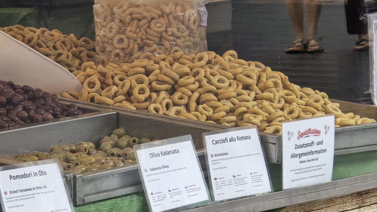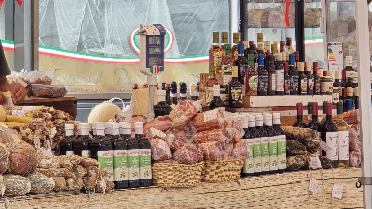 Schon beim Betreten des Marktplatzes wehen den Besuchern verführerische Düfte entgegen: Feine Wildsalami aus der Lombardei, würziger Schinken und Speck, kräftiger Bergkäse sowie duftendes Olivenöl und eingelegte Oliven aus Apulien. Auch Antipasti, frische Brotspezialitäten, original sizilianisches Gebäck, Parmesan und cremiger Büffelmozzarella gehören zum umfangreichen Sortiment.