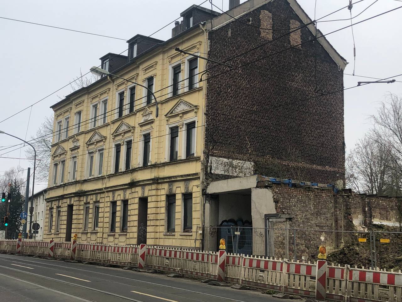Zwei marode Häuser im Norden von Essen werden endlich abgerissen. Die leerstehenden Gebäude direkt an der Straßenbahnhaltestelle Herbertshof in Stoppenberg sorgen seit Jahren für Probleme – und unter anderem auch für einen dauerhaften Engpass auf der Essener Straße. Eine Fahrspur ist dort seit über drei Jahren gesperrt, weil Teile der bröckelnden Fassaden auf den Gehweg oder die Straße zu stürzen drohen.