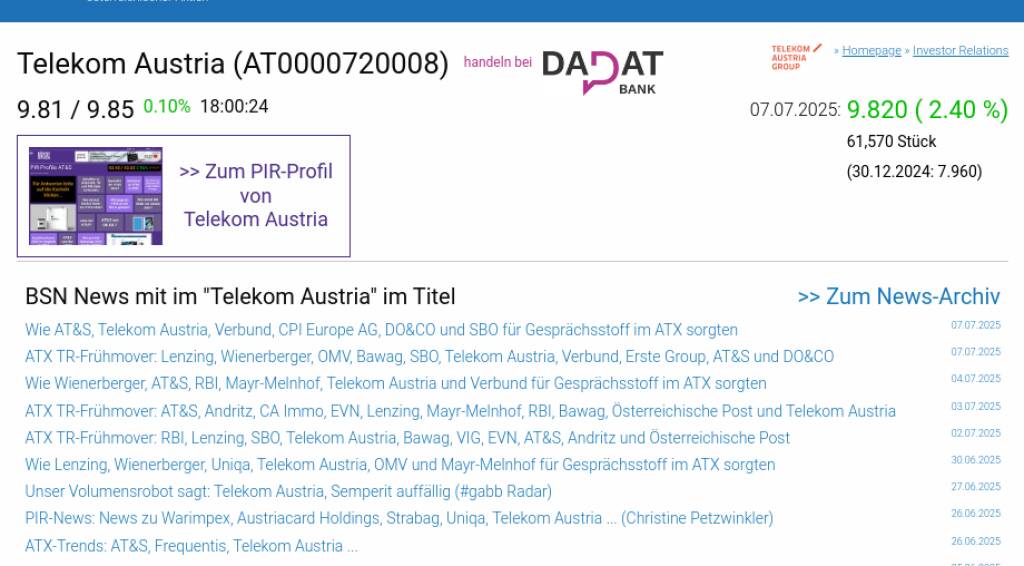 Telekom Austria am 7.7. 2,40%, Volumen 82% normaler Tage