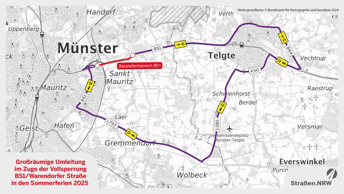 Während der Sommerferien ist die Warendorfer Straße in Höhe Umgehungsstraße für Bauarbeiten zwischen der Mondstraße und der Einmündung B 51 sechs Wochen lang voll gesperrt. Der Landesbetrieb Straßen.NRW möchte dort mit einem neuen Vorgehen mehrere Fliegen mit einer Klappe schlagen. Die Baustelle soll nicht nur deutlich schneller fertig werden, Verkehrsteilnehmende und Anwohnende werden weniger lang belastet und die Bauarbeiten nicht so sehr gestört. Ursprünglich war geplant rund neun Monate lang eine Baustellenampel aufzustellen und dann wären Autos und Laster immer direkt an den Bauarbeiten vorbeigefahren. Dennoch dürfte es auch während der sechs Wochen langen neu geplanten Bauphase lange Staus und Behinderungen rund um die Baustelle geben. Radler:innen, Linienbusse und Rettungsdienste können die Baustelle passieren, auch Anwohnende können ihre Häuser und Wohnungen erreichen. Weiträumige Umleitungen werden eingerichtet.