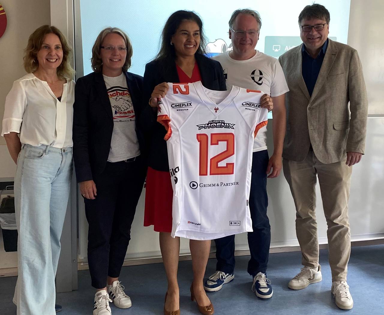 Freuen sich auf die Sportpartnerschaft (v.l.n.r.): Birgit Wenninghoff (Direktorin Mathilde-Anneke-Gesamtschule), Elke Wirtz (Vorstand ASC Münster), Preeti V. Shah (Generalkonsulin USA), Sven Schueler (Vorstand ASC Münster), Klaus Rosenau (Bürgermeister).© ANTENNE MÜNSTER
