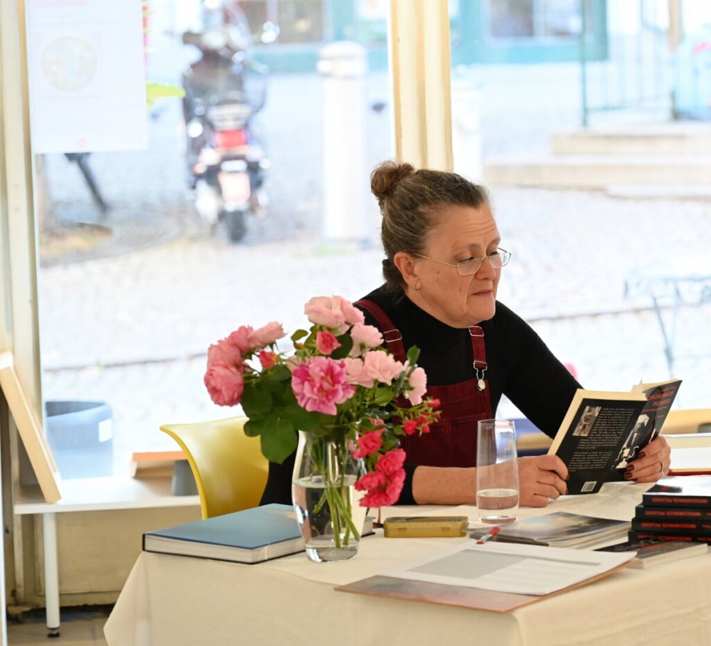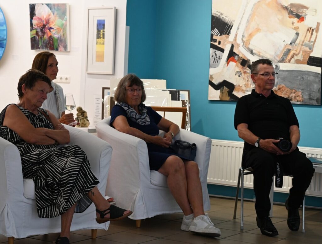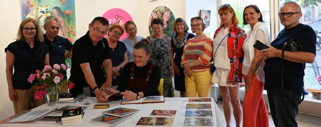 Angelika Toma präsentierte am 4. Juli 2025 im Atelier am Markt in Gmunden ihre Blumenbilder und las aus ihrem Roman „IMOSCHENKOS PICASSO und die Unwiederbringlichen“. Viele Besucherinnen und Besucher kamen, um Kunst und kritische Literatur in besonderer Atmosphäre zu erleben.