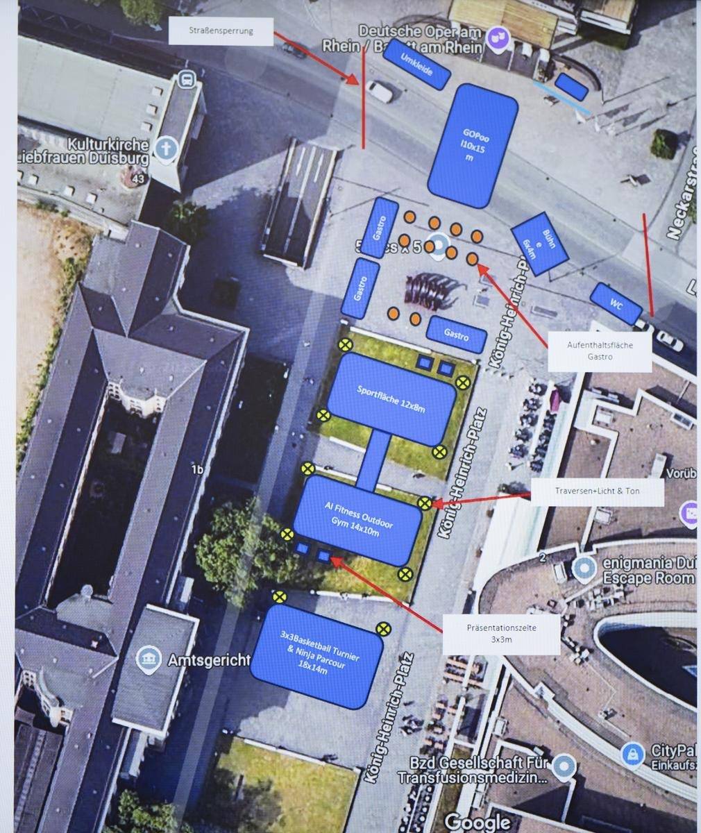 Der FISU Sportcampus vor dem Duisburger Stadttheater nimmt konkrete Formen an. Gestern wurde das mobile Schwimmbecken auf dem Opernplatz aufgebaut, heute fließt das Wasser hinein.