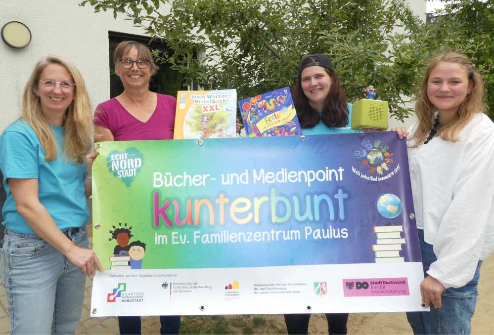 Freuen sich über den neuen Bücher- und Medienpoint „kunterbunt“ (v.l.): Melanie Bertram (Ev. Familienzentrum Paulus), Heike Lindenblatt (Amt für Stadterneuerung), Lea Bergmeier (Ev. Familienzentrum Paulus) und Theresa Ramlau (Quartiersmanagement Nordstadt). Foto: QM Nordstadt