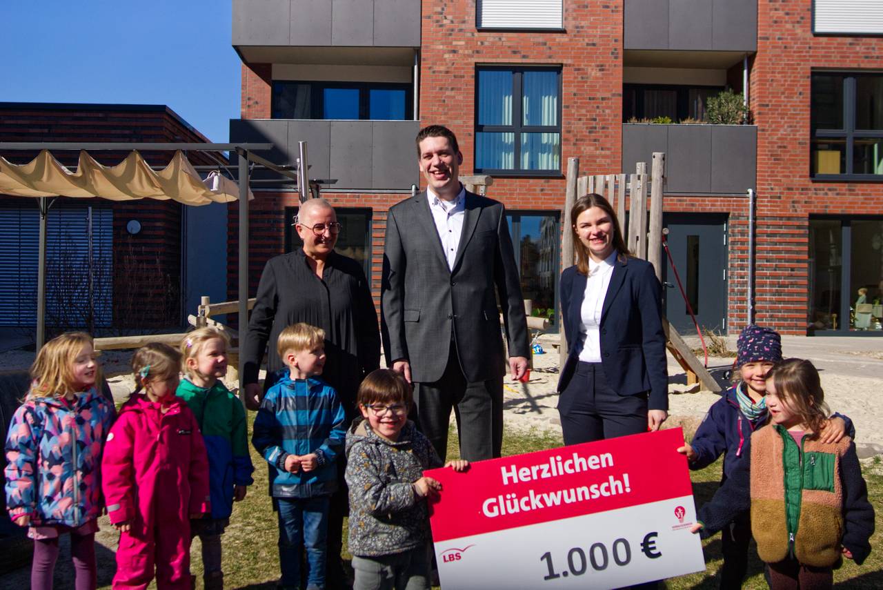 LBS-Gebietsleiter Michael Pawlik und LBS-Immobilienberaterin Daniela Sechkin (r.) gratulierten Leiterin Tanja Rüschoff und den Kindern der Kita Süd zum Gewinn von 1.000 Euro beim LBS-Vorausdenker-Wettbewerb 2025.© LBS NordWest