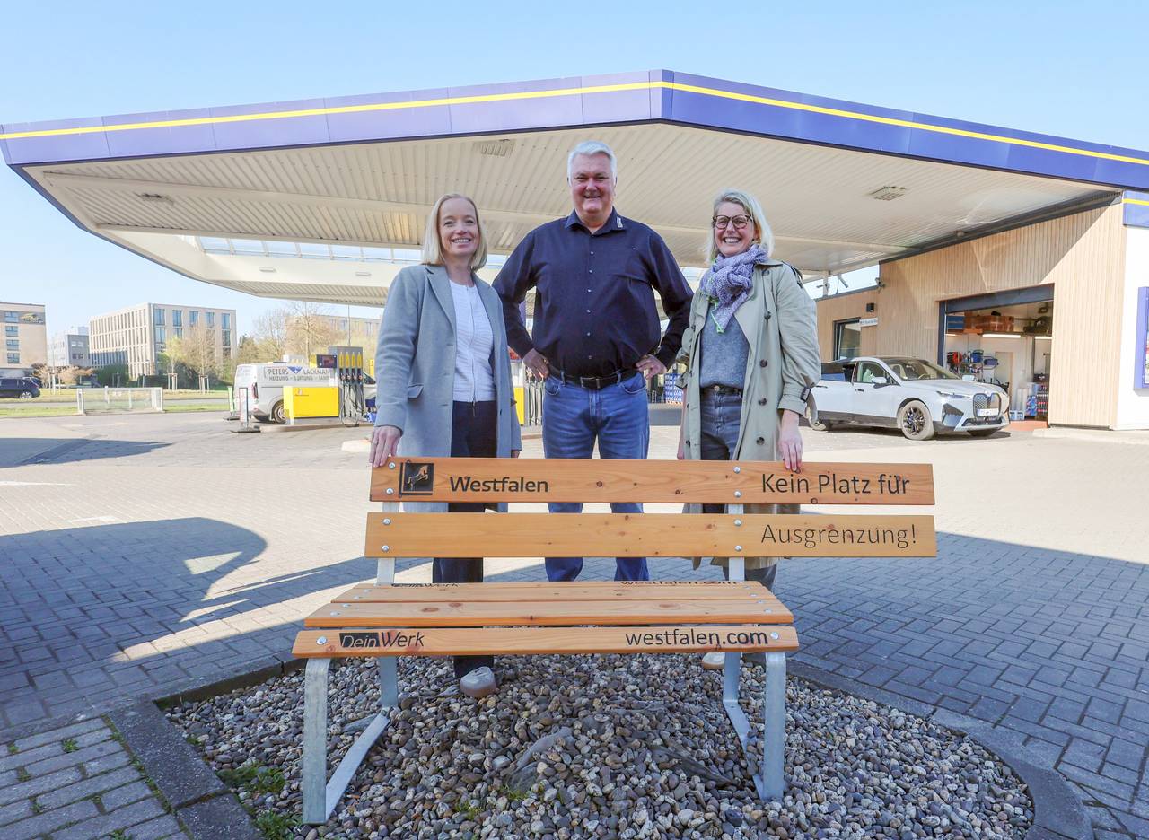 Setzen mit der Bank gegen Ausgrenzung ein gemeinsames Zeichen: Sandra Schütte (Mitglied der Westfalen-Geschäftsleitung), Jörg Binding (Pächter der Westfalen-Tankstelle Steinfurter Straße 166, Münster) und Henrike Koch (Westfalen-Diversity-Team).