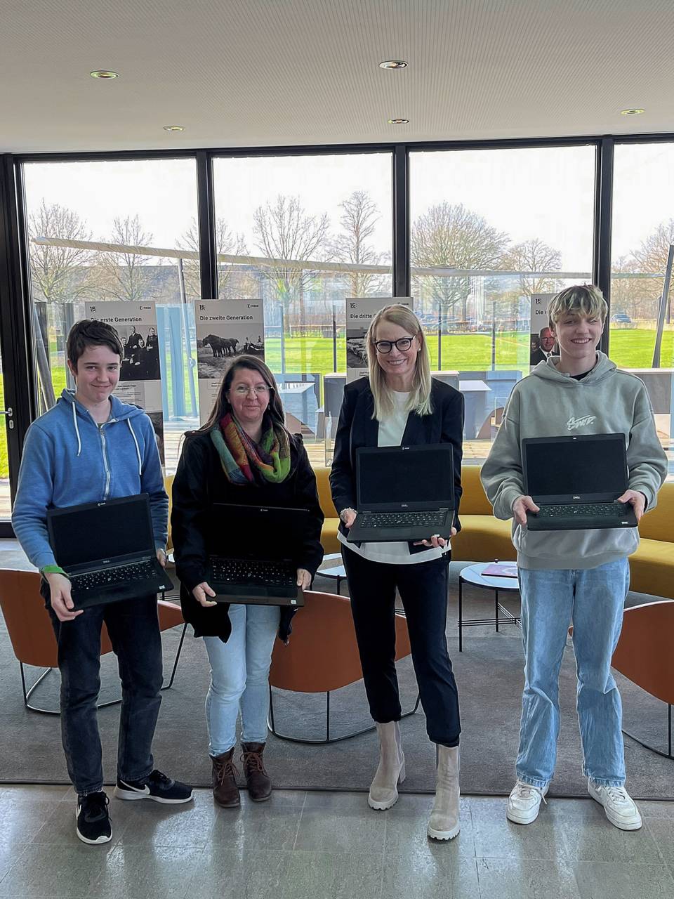 Laptopspende an die Outlaw Kinder- und Jugendhilfe in Münster: Rebecca Gratz (2.v.l.), Koordinatorin im IT-Support bei Outlaw, Martina Schlottbom (2.v.r.), Vorständin der Josef Fiege Stiftung, sowie Jannis P. (l.) und Lion S. (r.).