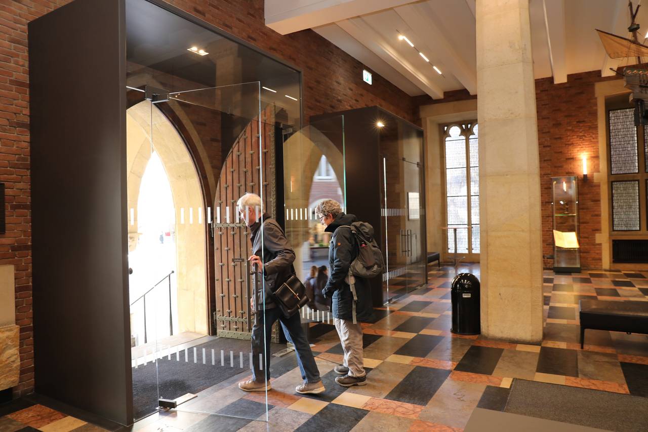 Die neuen Windfänge aus Glas an den beiden Eingangstüren am Prinzipalmarkt sorgen für mehr Tageslicht in der Bürgerhalle, ohne dass der Raum zu stark auskühlt.© Stadt Münster