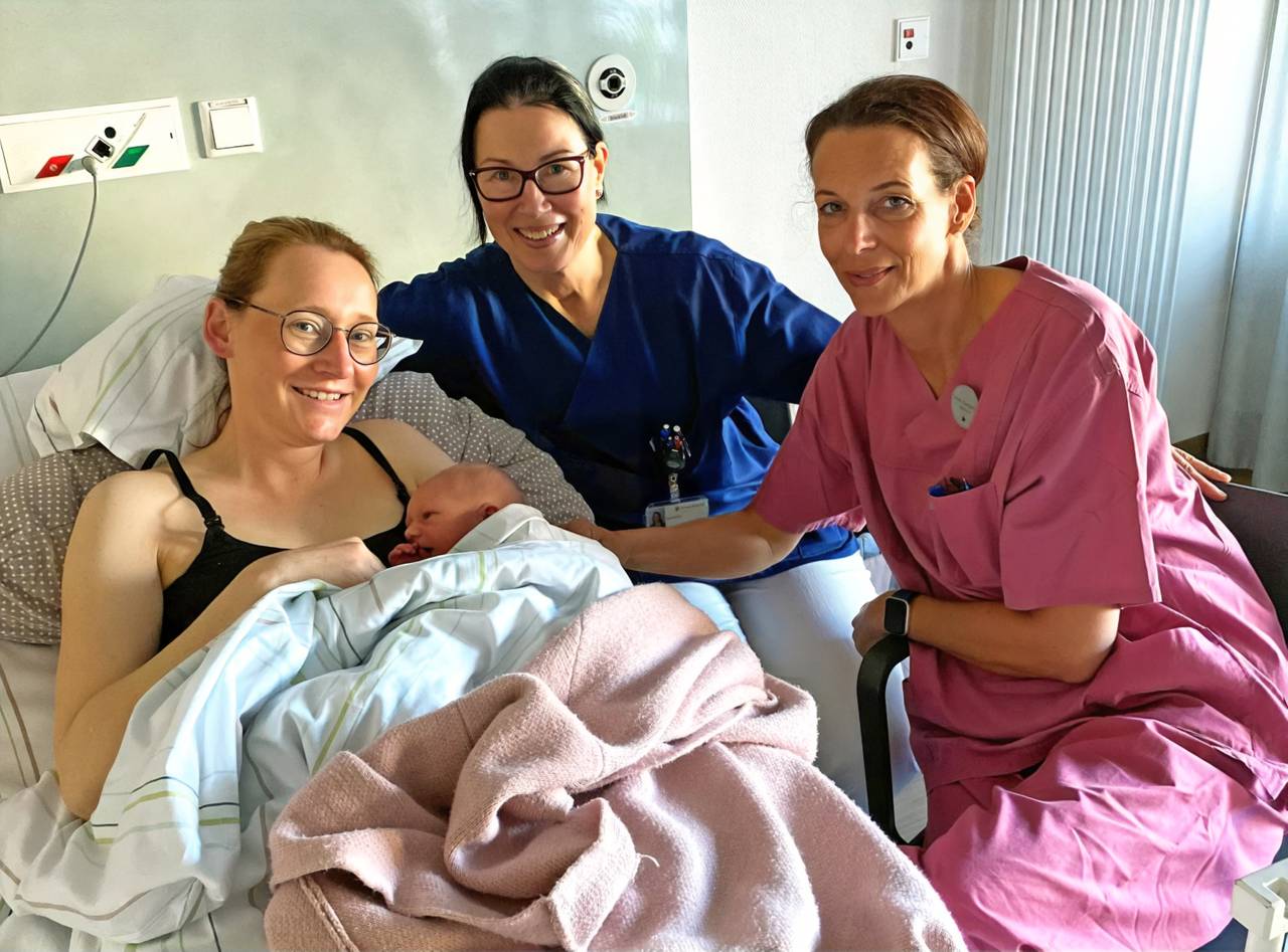 Stellvertretend für das Kreißsaal-Team des Clemenshospitals wünschen Oberärztin Kerstin Kaste (m.) und Hebamme Tanja Decarrois (r.) Victoria Mertens-Krieter (l.), ihrem Sohn Ole und der ganzen Familie alles Gute für die gemeinsame Zukunft.