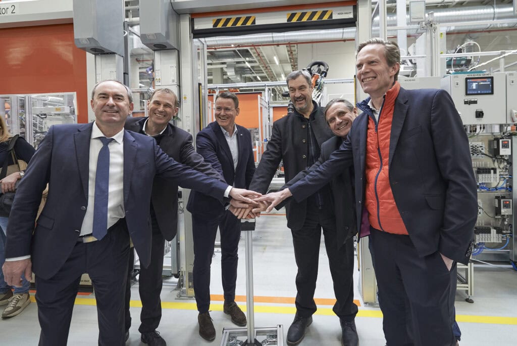 Beim Start der Batterie-Serienproduktion am Standort Nürnberg: Staatsminister Hubert Aiwanger, Michael Kobriger, MAN-Vorstand für Produktion und Logistik, MAN-Vorstandsvorsitzender Alexander Vlaskamp, der Bayerische Ministerpräsident Dr. Markus Söder, Markus Wansch, Betriebsratsvorsitzender Standort Nürnberg und Dr. Frederik Zohm, MAN-Vorstand für Forschung und Entwicklung (von links).