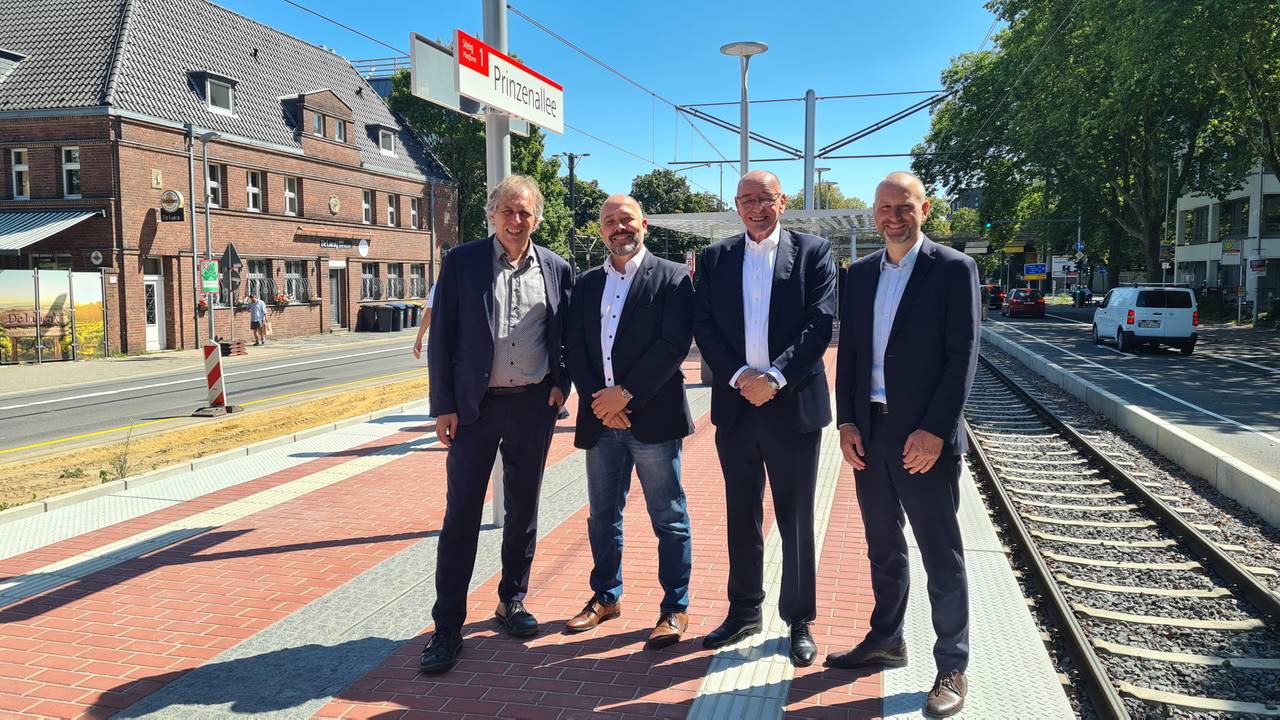 Von links nach rechts: Jochen Kral (Dezernent für Mobilität und Umwelt der Stadt), Dr Andreas Ferlic (Interimsbereichsleiter Inftrastruktur der Rheinbahn), Rolf Tups (Bezirksbürgermeister), Marc Nüßen (Abteilungsleiter Fördermanagement Verkehrsverbund Rhein-Ruhr)© Antenne Düsseldorf