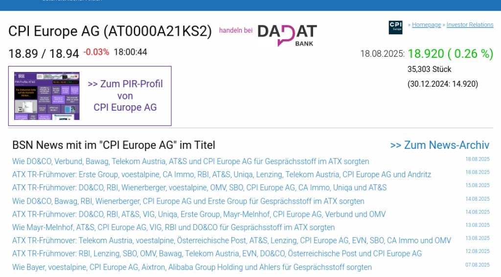 CPI Europe AG am 18.8. 0,26%, Volumen 68% normaler Tage
