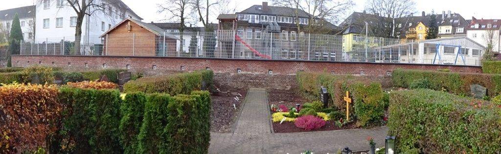 In Essen grenzt die Bardelebenschule direkt an den Friedhof an der Rühlestraße. Der Schulhof liegt oberhalb einer Mauer, einige Meter tiefer liegen die Gräber. Die Stadt hatte ein Problem: Die mehr als hundert Jahre alte Mauer stand nicht mehr sicher. Etwa ein Meter der alten Backsteinmauer musste abgetragen und neu aufgebaut werden. Damit alles wieder richtig hält und weder für die Schülerinnen und Schüler noch für die Besucherinnen und Besucher auf dem Friedhof eine Gefahr besteht, wurde die Mauer zunächst mit sieben Meter langen Erdnägeln verankert. Danach wurden die Fugen im unteren Teil der Mauer erneuert und der obere Teil mit neuen Klinkersteinen wieder aufgebaut. Jetzt ist zwar der Unterschied zwischen dem alten und dem neuen Teil deutlich sichtbar, aber die Mauer hält wieder. Außerdem gibt es in dieser Mauer eine Besonderheit. Einige der neuen Steine sind Nistklinker. Das sind Klinkersteine, die praktisch eine Nisthöhle für Vögel und Fledermäuse sind, erklärt Architekt Rolf Galle im Interview mit Radio Essen-Stadtreporterin Anna Bartl.