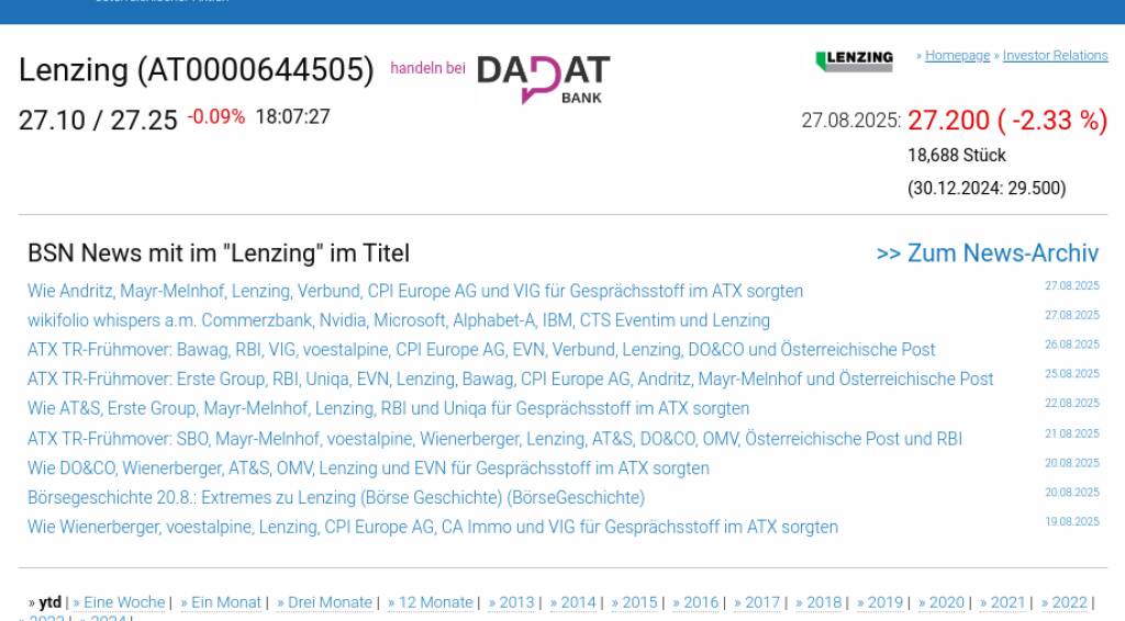 Lenzing am 27.8. -2,33%, Volumen 31% normaler Tage