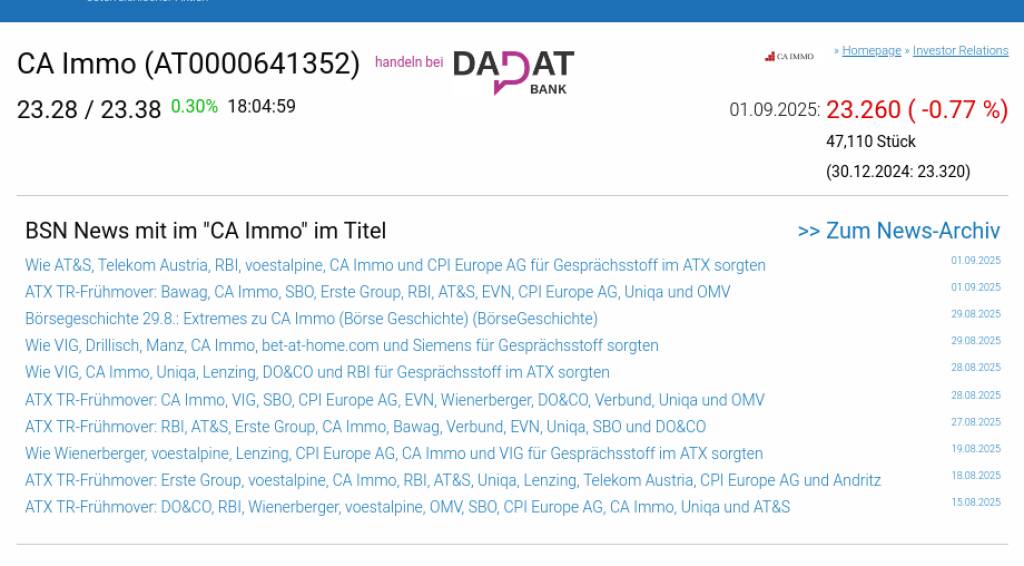 CA Immo am 1.9. -0,77%, Volumen 62% normaler Tage