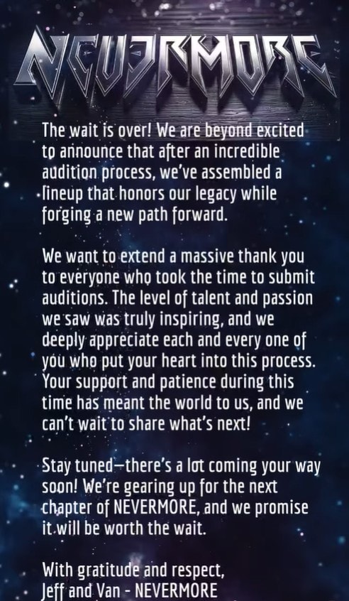NEVERMORE haben via Instagram den aktuellen Stand der Dinge zum geplanten Comeback durchgegeben. So ist die Bewerbungsphase um die Positionen Bass und Gesang wohl abgeschlossen und Gitarrist Jeff Loomis und Schlagzeuger Van Williams haben sich für zwei Kandidaten entschieden: