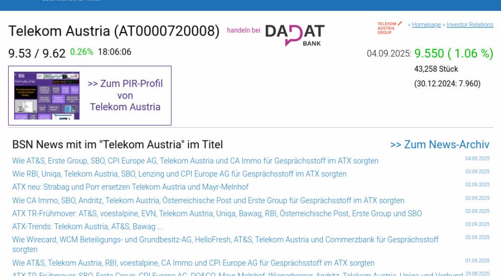 Telekom Austria am 4.9. 1,06%, Volumen 63% normaler Tage